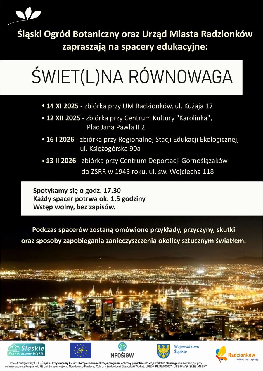 Terminy: 14 XI 2025 - zbiórka przy UM Radzionków, ul. Kużaja 17 12 XII 2025 - zbiórka przy Centrum Kultury "Karolinka", Plac Jana Pawła II 2 16 I 2026 - zbiórka przy Regionalnej Stacji Edukacji Ekologicznej, ul. Księżogórska 90a 13 II 2026 - zbiórka przy Centrum Deportacji Górnoślązaków do ZSRR w 1945 roku, ul. św. Wojciecha 118