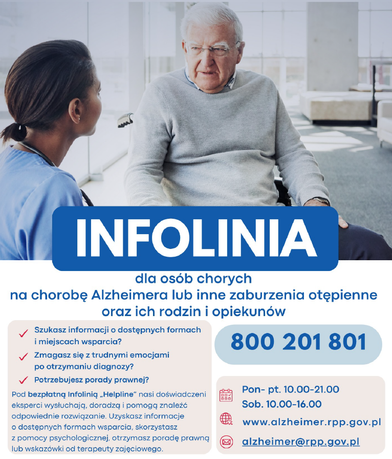 Infolinia dla osób chorych na chorobę Alzheimera i inne zaburzenia otępienne oraz ich rodzin i opiekunów.